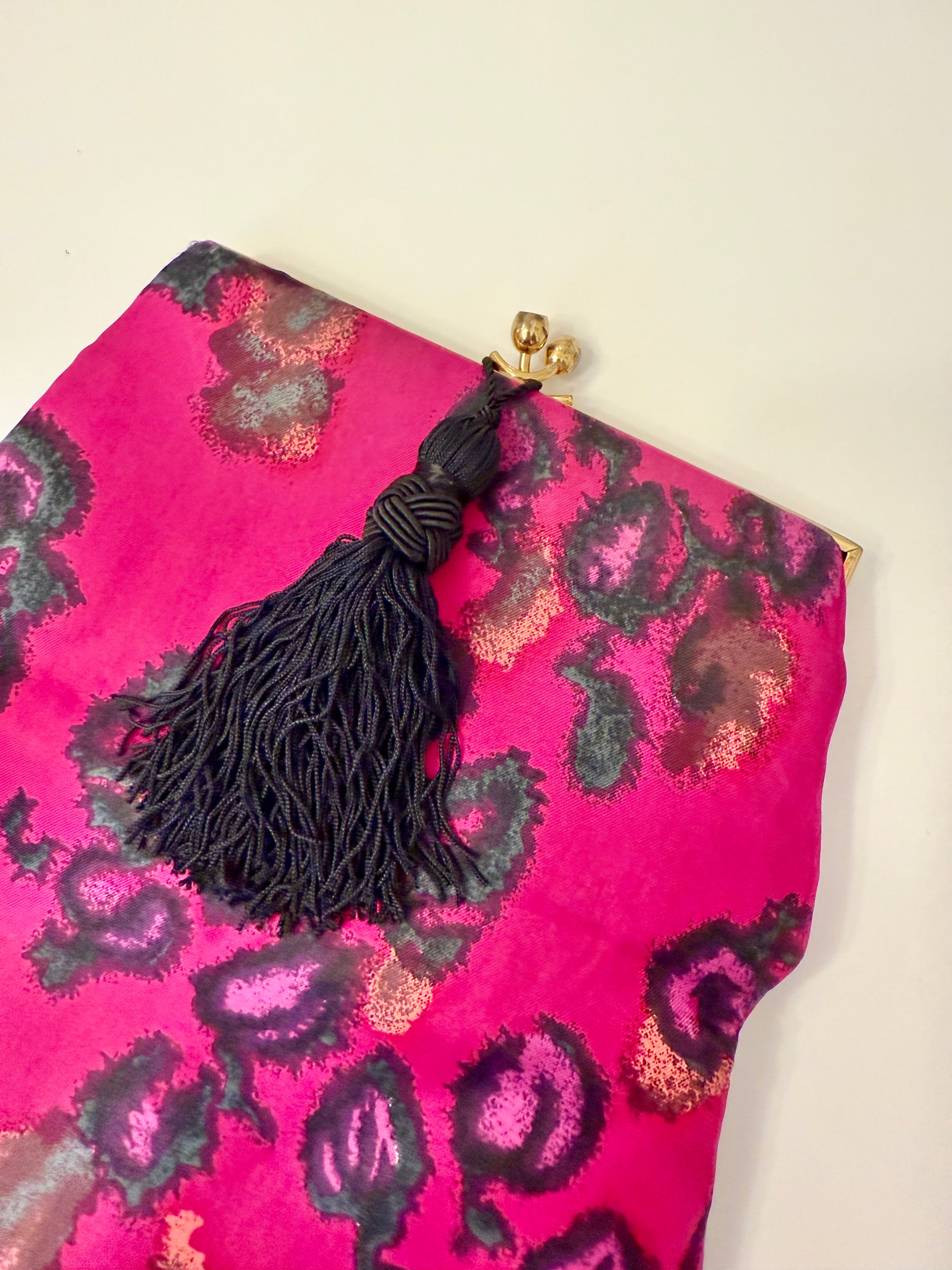 A true mid century gem! All the ladies in the 1960's loved a classic pink flower clutch bag. This is truly darling, love the color and tassel. A perfect pop of color. In good vintage condition. Made beautifully, and high quality designed. Just lovely. I can see this being worn with your holiday velvets, to your seersucker strapless dress... xo