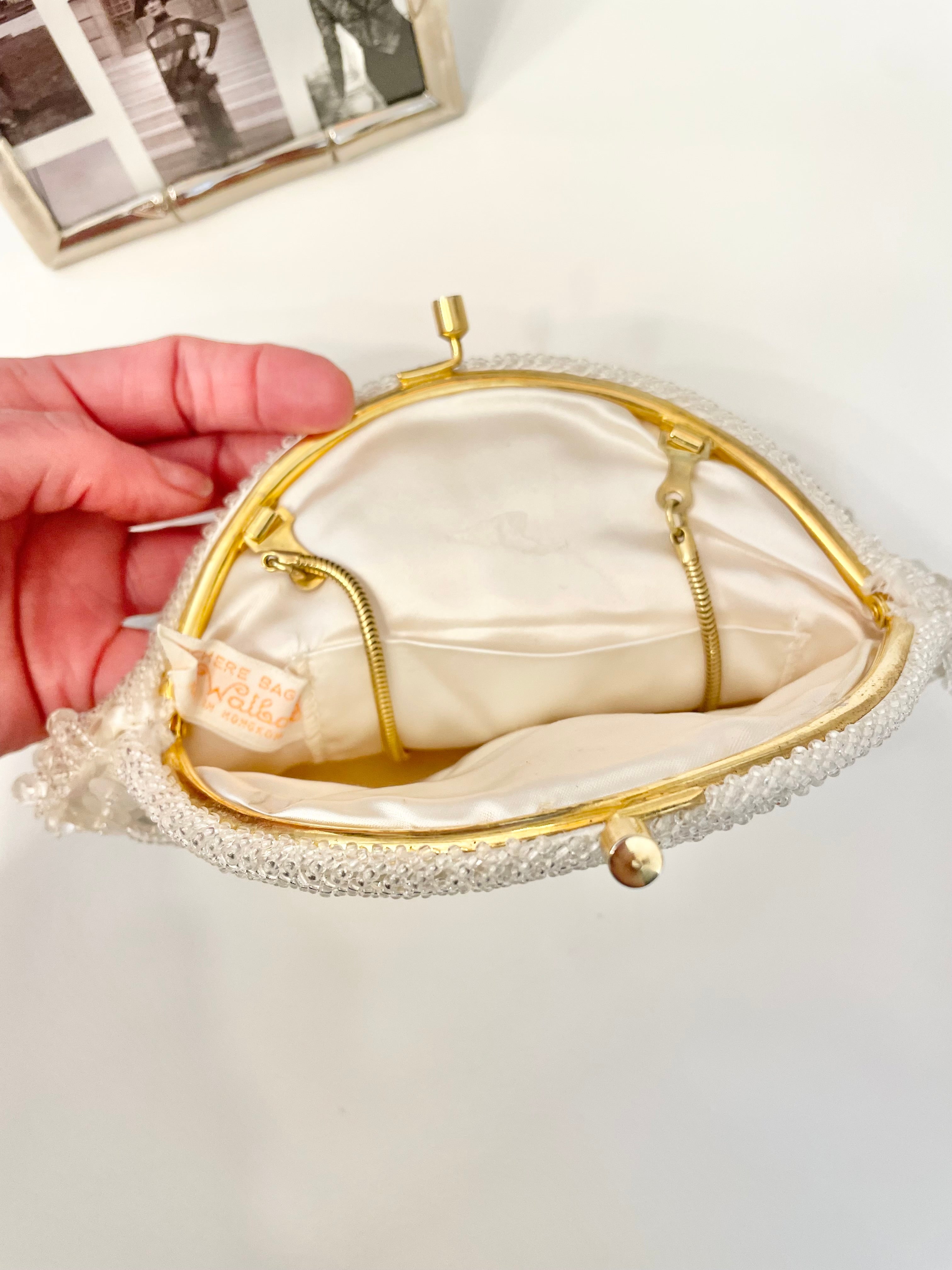 A true mid century gem! All the ladies in the 1960's loved a classic ivory beaded cha cha bag... Truly special Walborg bag. A mid Century delight. A perfect party gal bag. In excellent condition. Made beautifully. Just lovely. I can see this being worn with your holiday velvets, to your seersucker strapless dress... xo