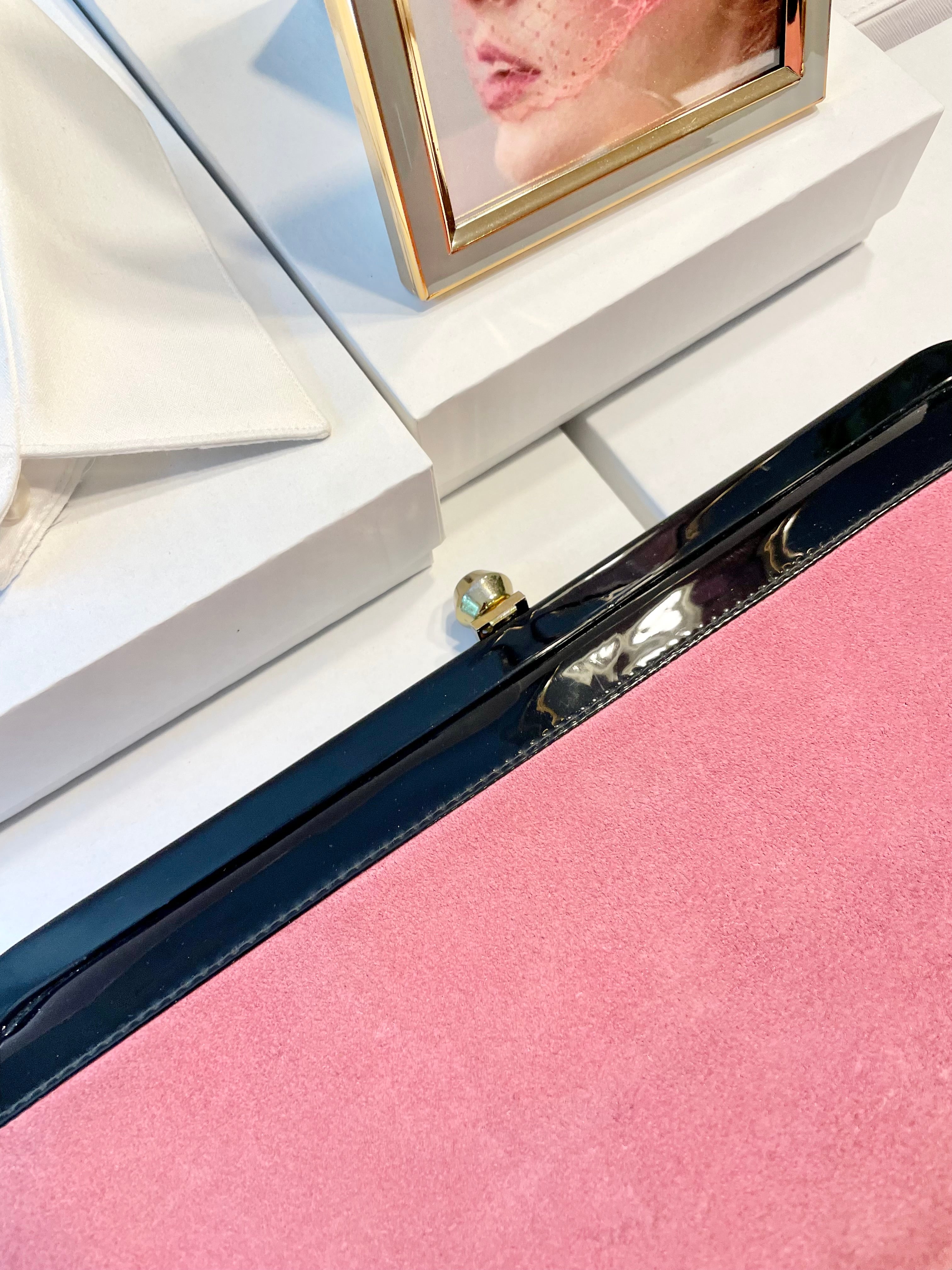 A true mid century gem! All the ladies in the 1960's love a classic suede clutch bag. This on is so unique, and stunning. A perfect pop of color. In great vintage condition, a tiny bit of wear to the bag, but still beautiful! Just lovely. I can see this being worn with your holiday velvets, to your seersucker strapless dress. So rich looking, and so rare to find this style bag.. adore the marriage of the soft pink suede, with the richness of the black patent leather.... I adore this design. Modern, yet so classy!