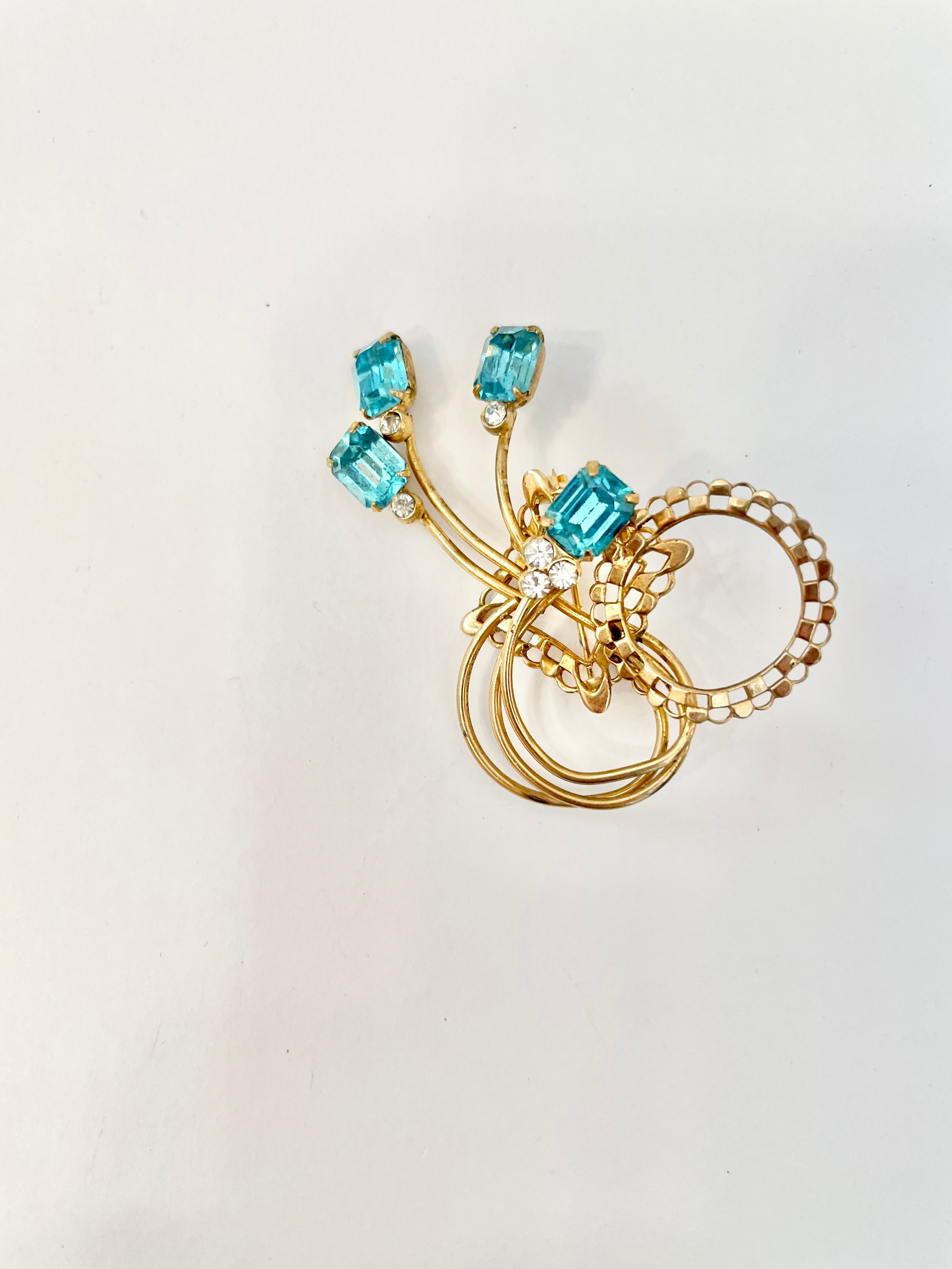 A true mid century gem! All the ladies in the 1960's loved a classic gold brooch. This on is truly are stunning. A perfect pop of color. I adore the blue/teal emerald cut glass stones. So rich looking... a classy brooch. Very high quality designed, and made beautifully.In excellent condition. Just lovely. I can see these being worn with your holiday velvets, to your seersucker strapless dress. A truly classic brooch.